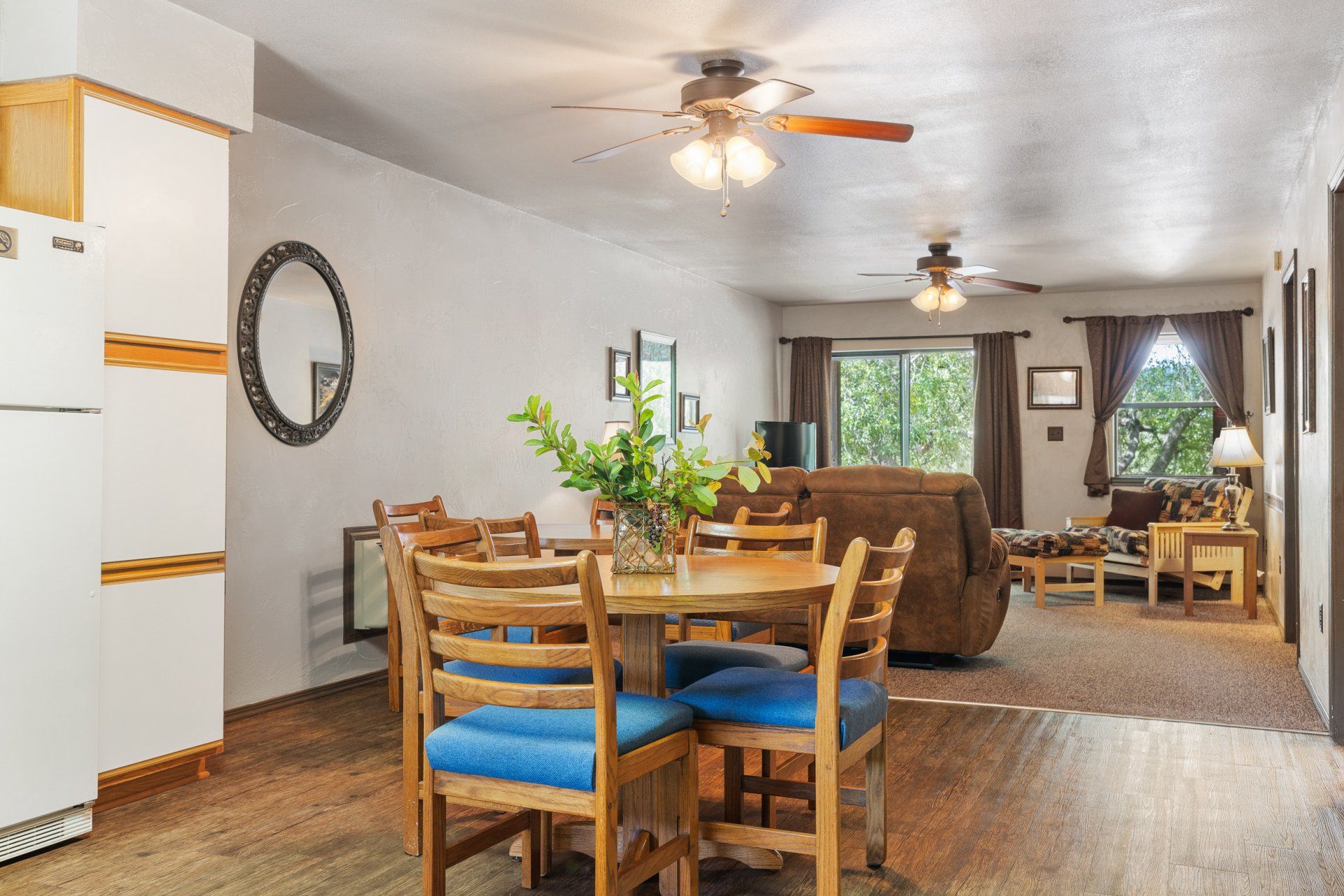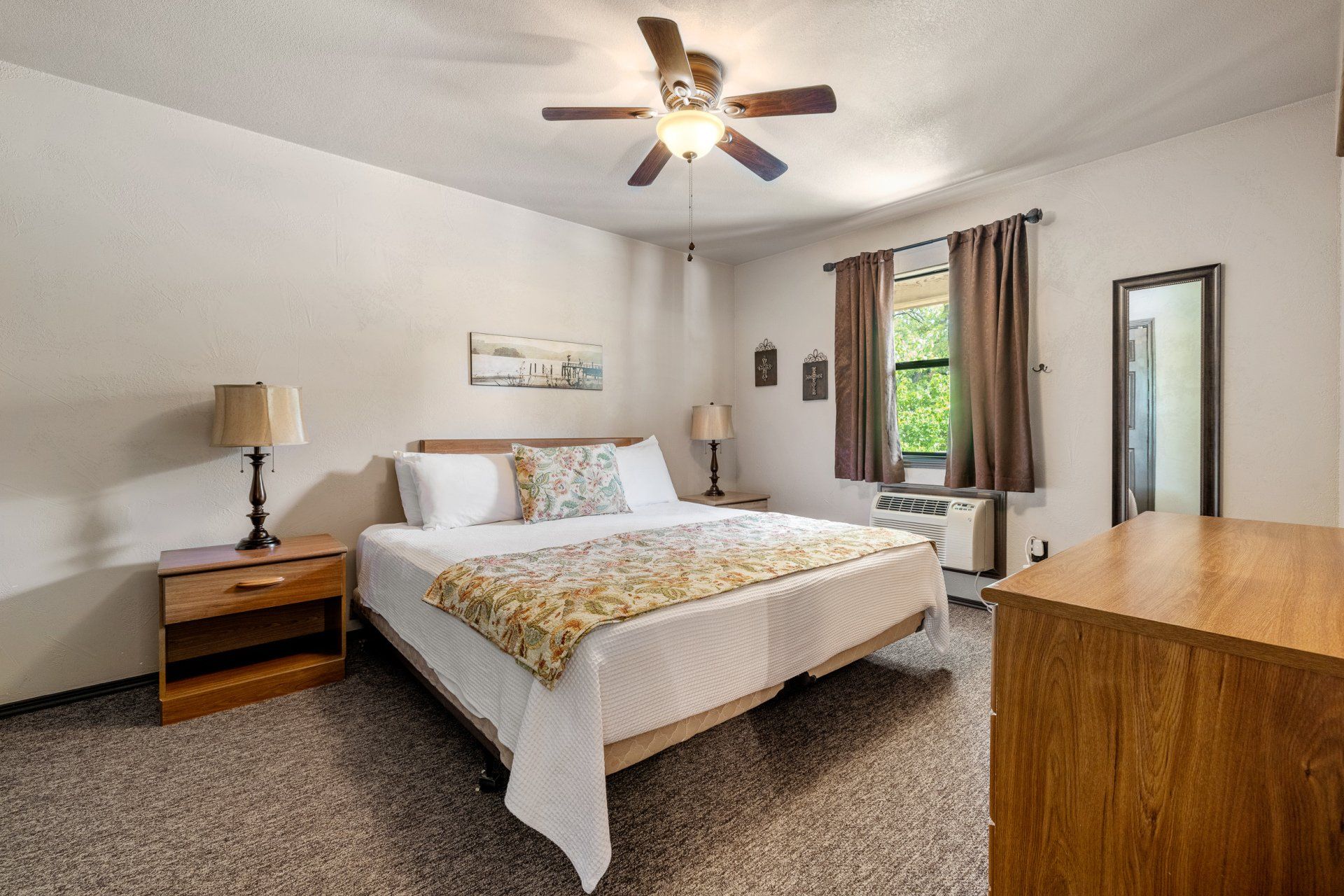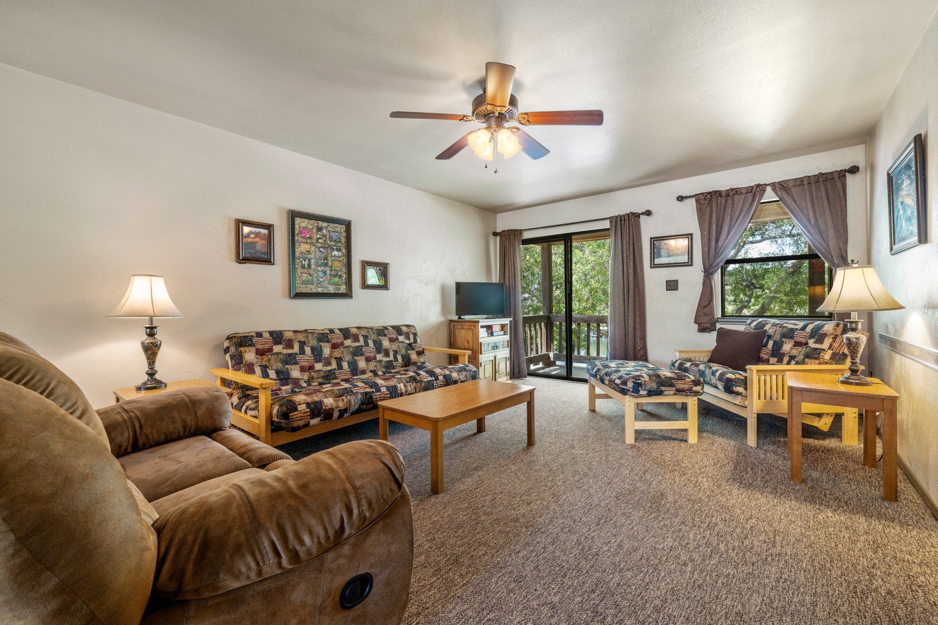 The one bedroom condos sleep up to 4 people with a queen bed in the bedroom and two full-sized futon sofas/beds in the living room. Each condo has a private balcony that overlooks the lake.