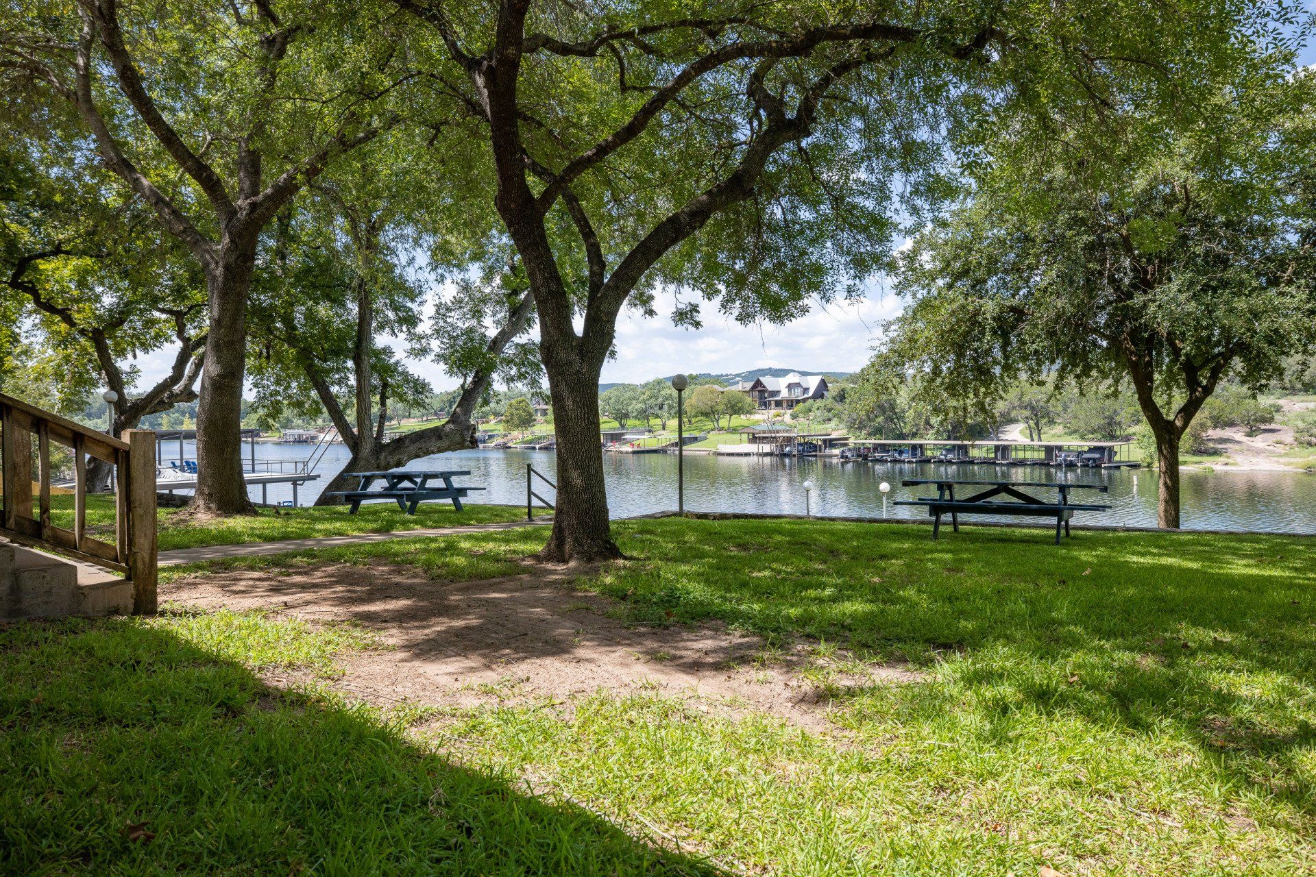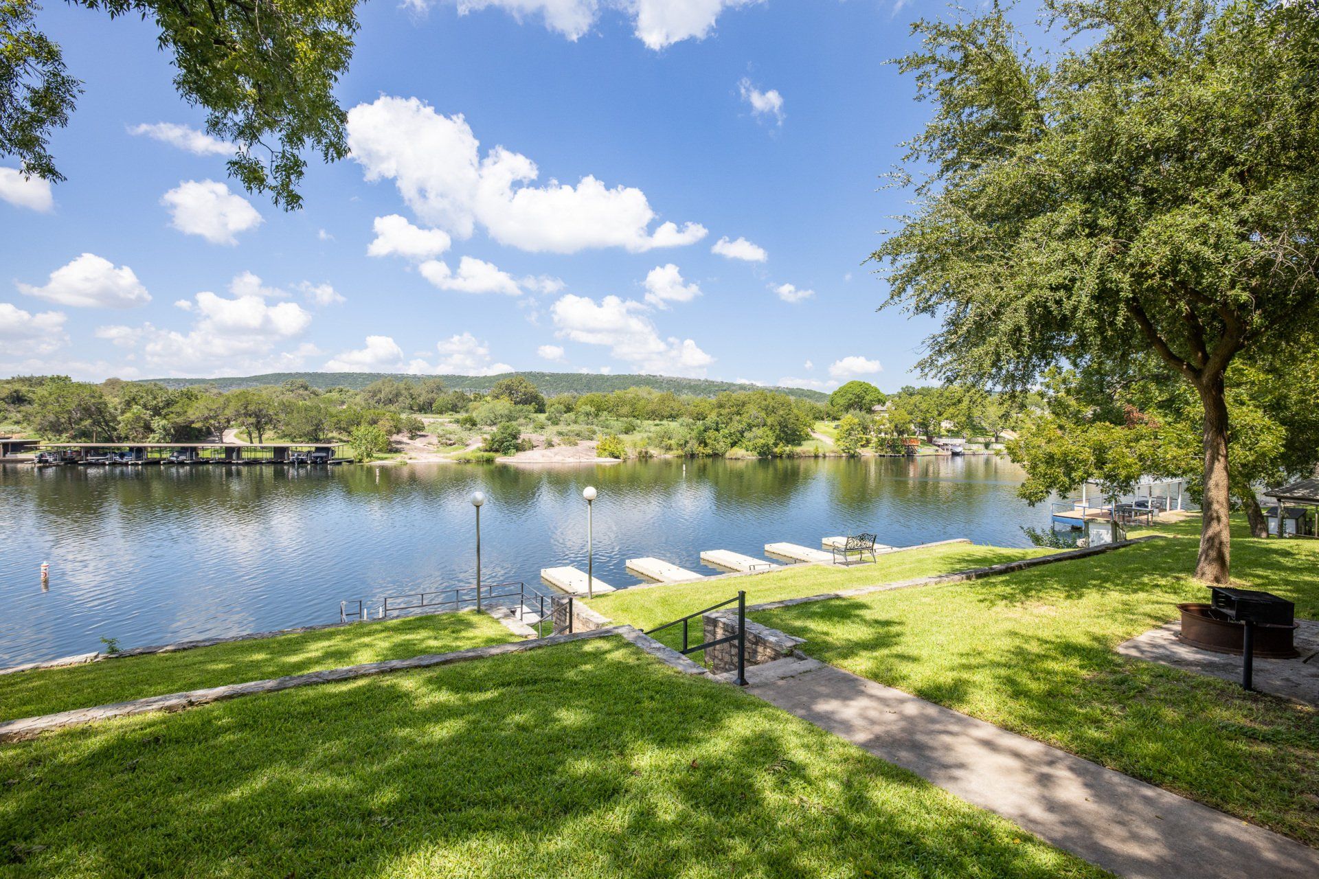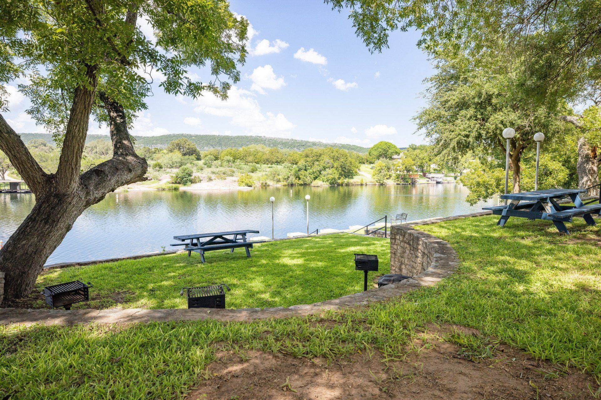 The 2 bedroom condos can sleep up to 7 people with a king-sized bed, a queen-sized bed, a full-sized futon sofa/bed and a single futon sofa/ bed. The private balcony at the rear of the condos overlooks Lake LBJ and is shaded by the pecan trees. The condos also offer a view of the lake from the living rooms.